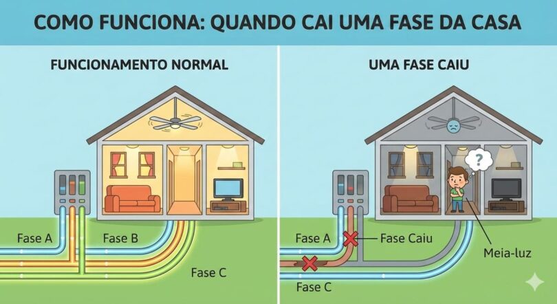 Quando dizemos que “caiu uma fase”, significa que um desses caminhos parou de trazer energia. É como se uma estrada de três faixas tivesse uma delas bloqueada: os carros (a energia) ainda conseguem passar pelas outras duas, mas quem precisava usar aquela faixa específica vai ficar parado.